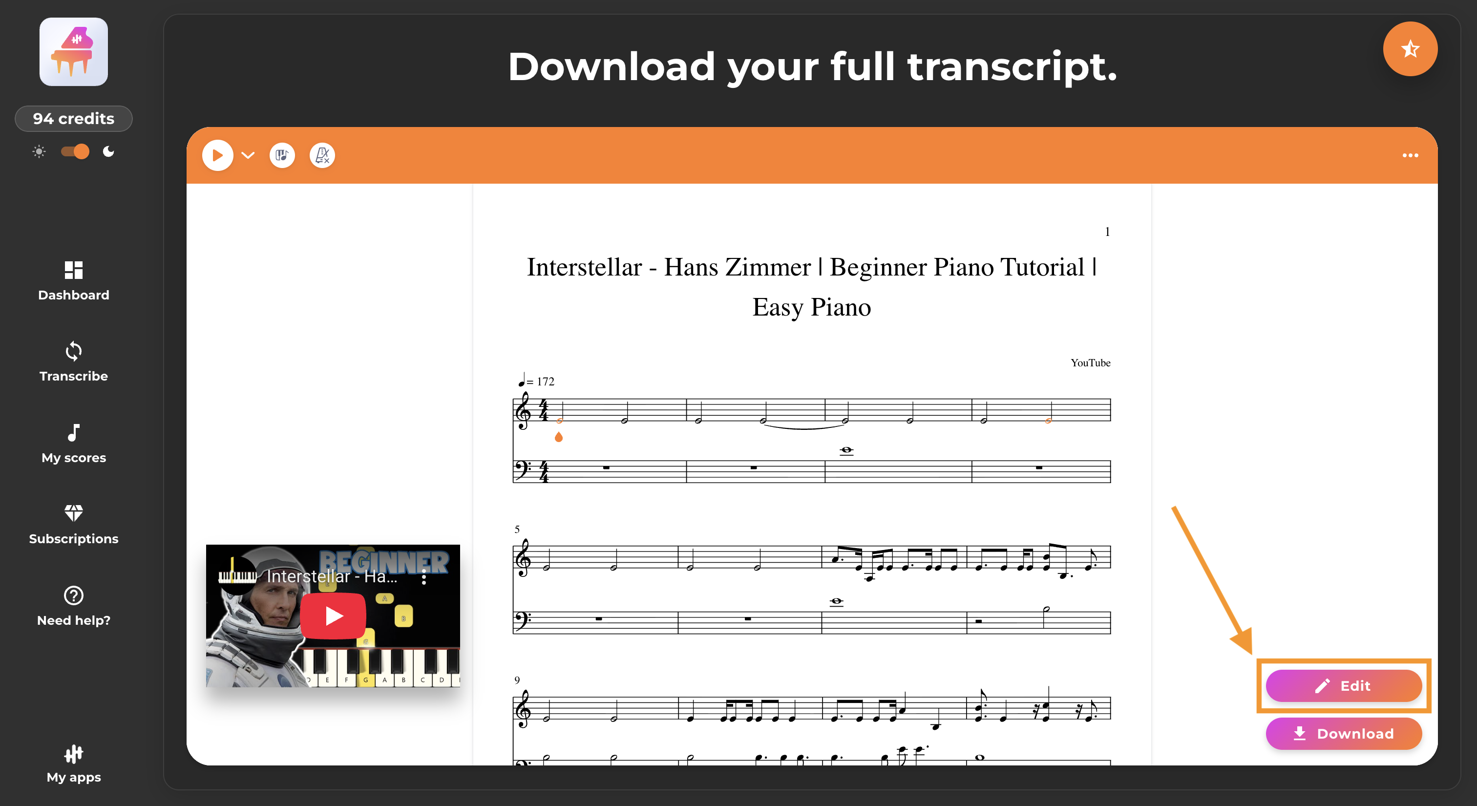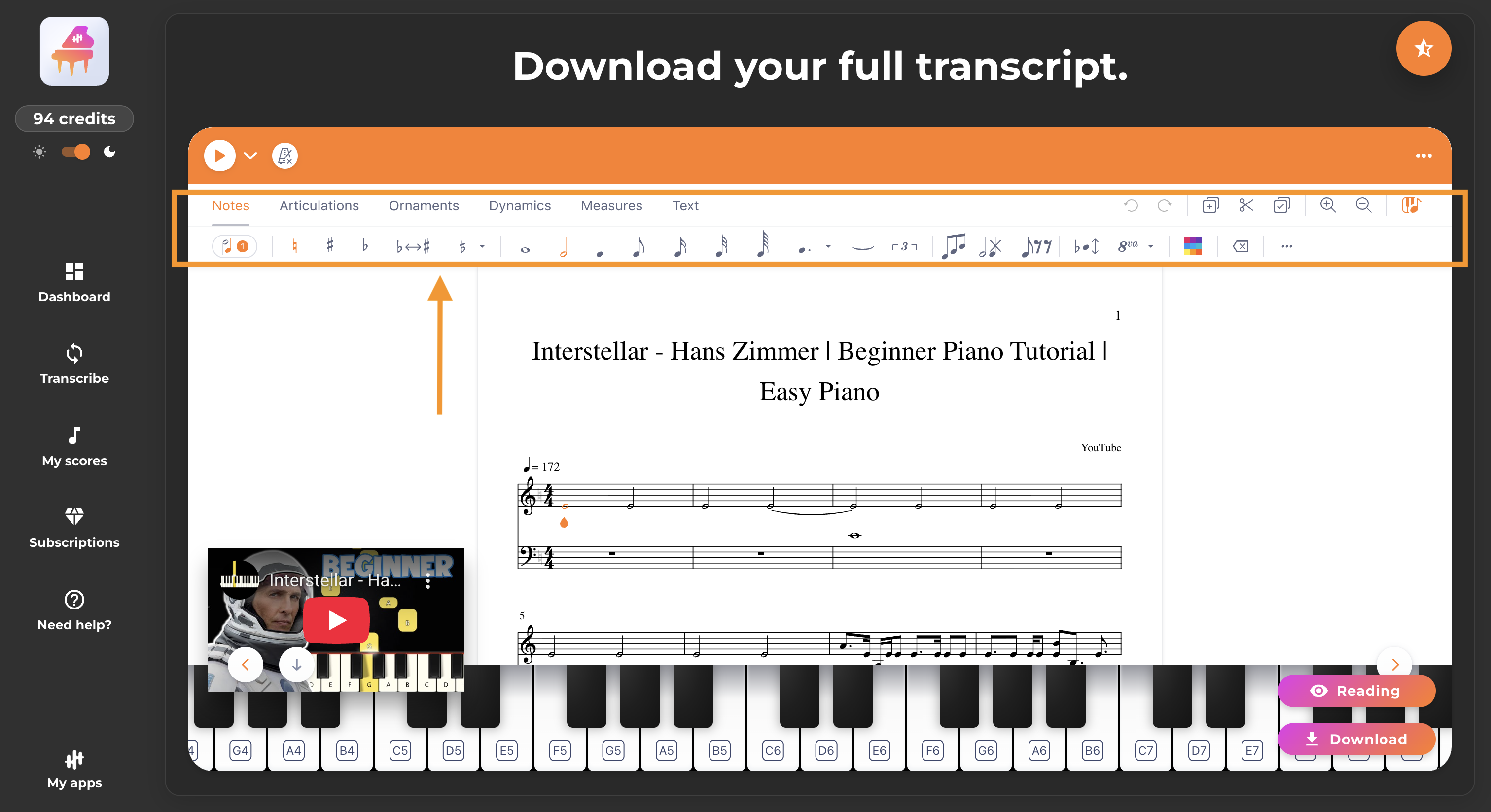 - Für die Bearbeitung: „Bearbeiten Sie Ihre Partitur mit dem Editor La Touche Musicale”