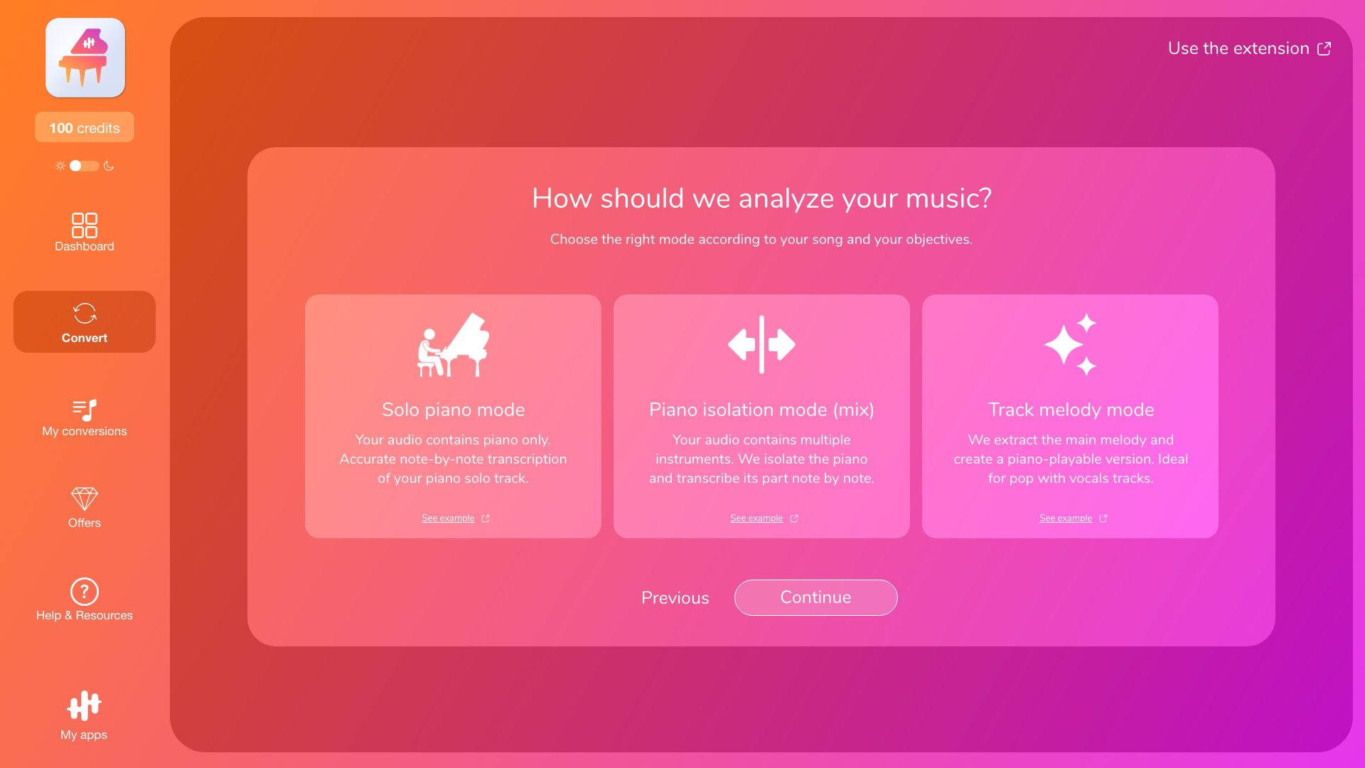 Wenn Sie eine Partitur oder eine MIDI-Datei für Klavier wünschen, ist PianoConvert die richtige Wahl. Wenn Sie eine Gitarrentabulatur wünschen, ist GuitarConvert die richtige Wahl usw.