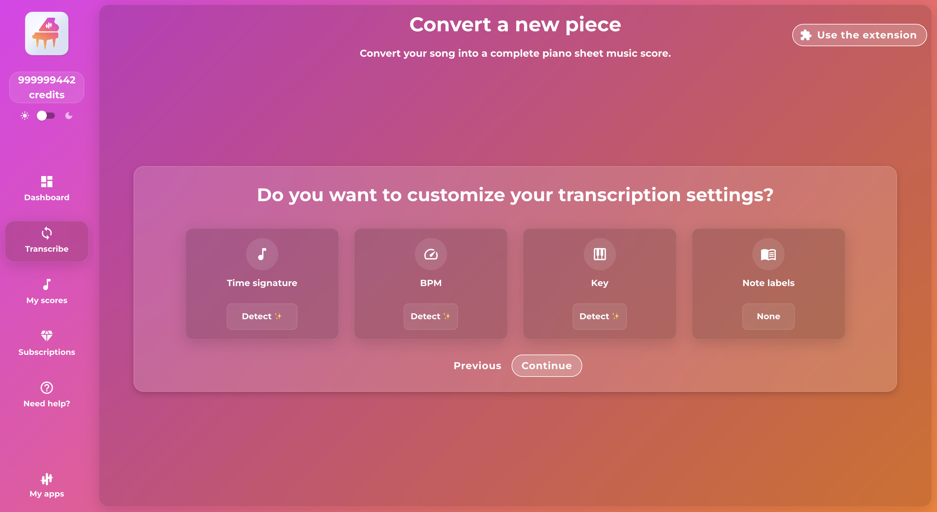 When the conversion is complete, you can access your results and download your files (PDF, MIDI, MusicXML, tablature depending on the app). You can also find all your conversions in your account (“My conversions” / “My transcriptions”).