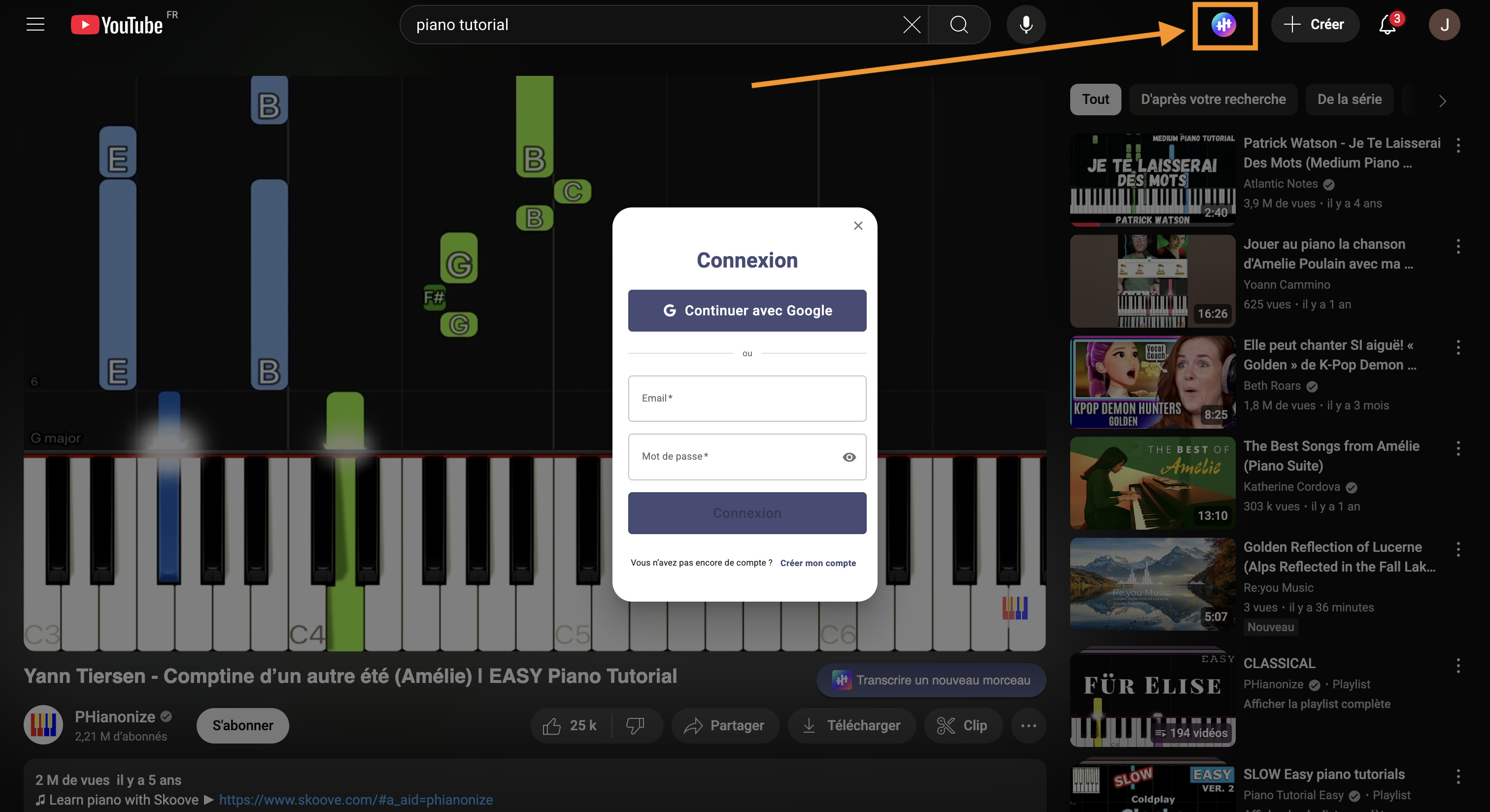 Cliquez sur l'icône de l'extension La Touche Musicale en haut à droite de l'interface et créez votre compte ou connectez-vous à votre compte La Touche Musicale en 2 clics :