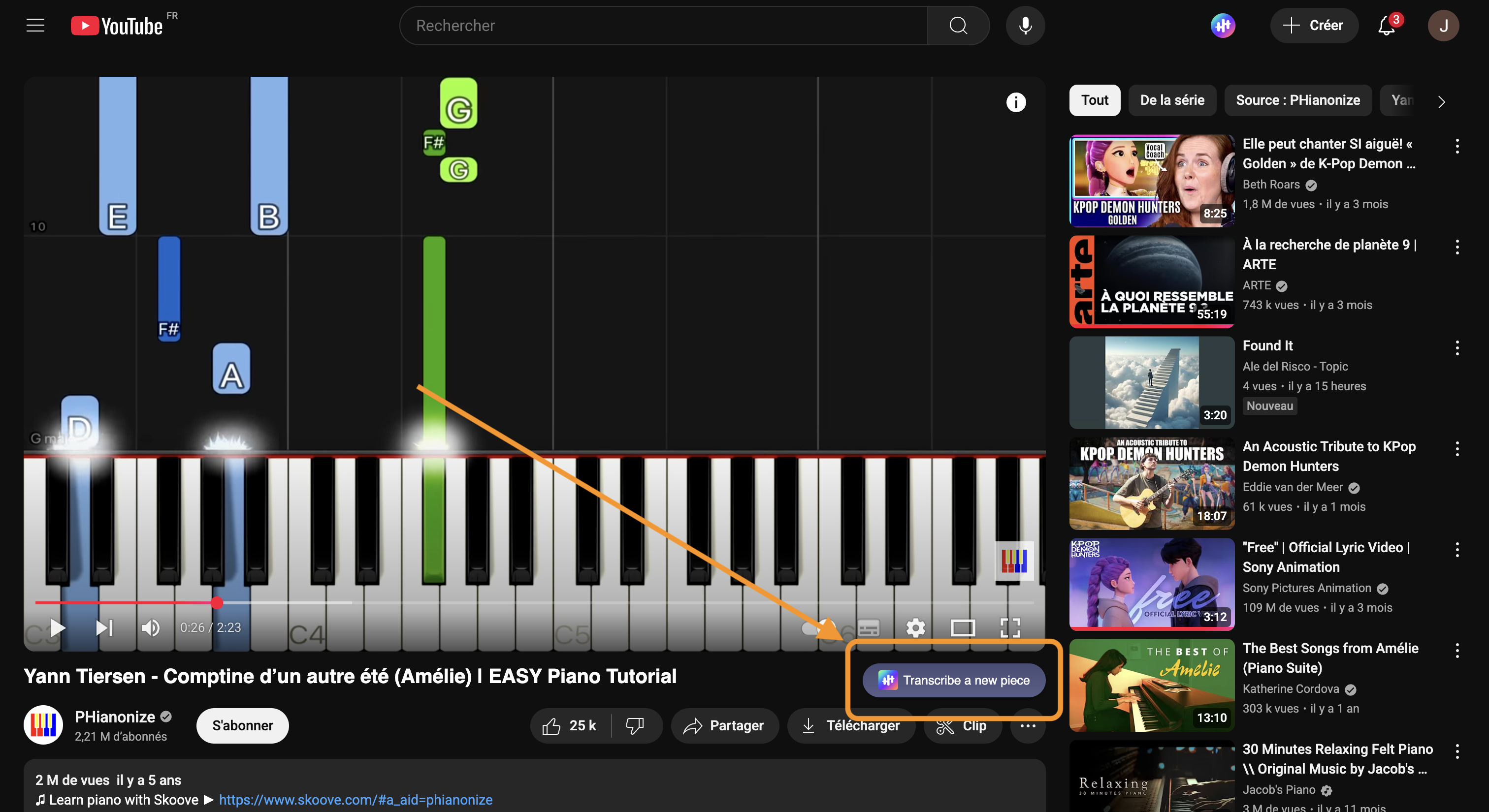 Une fois sur la page YouTube, un bouton “Convertir en partition” apparaît sous la vidéo.